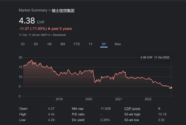 直至今天,虽然瑞信暂时还没倒闭,但是其股价也始终在5瑞郎以下,基本上和欧洲的农村信用合作社银行价格差不多。