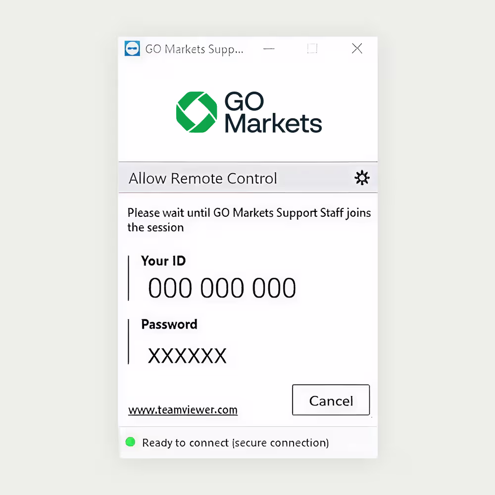3. Provide your ‘TeamViewer ID’ and ‘Password’ to the GO Markets support team every time you need help.