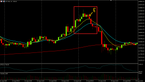 Strong pinbar reversal with confirmation candle immediate after pinbar. Entry at E at candle close.[/caption]
