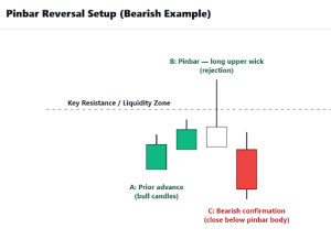 A: Prior advance (bull candles) → strong push into a resistance zone.B: Pinbar (long upper wick) → rejection of higher prices as sellers absorb demand.C: Confirmation candle (bearish close) → follow-through selling that validates the reversal and closes BELOW the pinbar candle body.You can see a real-world example of this on the BTCUSD - 1 hourly chart:[caption id="attachment_712324" align="aligncenter" width="582"]