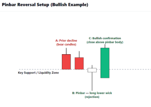 The pinbar reversal setup captures shifts in market sentiment in a clear, visual way. Its popularity amongst traders is a reflection of its successes and its relative simplicity, even for less experienced traders. By combining context (support/resistance zones), structure (A/B/C sequence), and disciplined risk management, traders can use pinbars as part of a robust price action strategy.However, it is worth noting that not every pinbar is significant. The most reliable signals occur at meaningful levels, with confirmation from the next candle. Invest some of your time practicing, seeing how many you can spot on various historical charts (and of course, make notes on what happened next) to build confidence in recognition before trading them live.