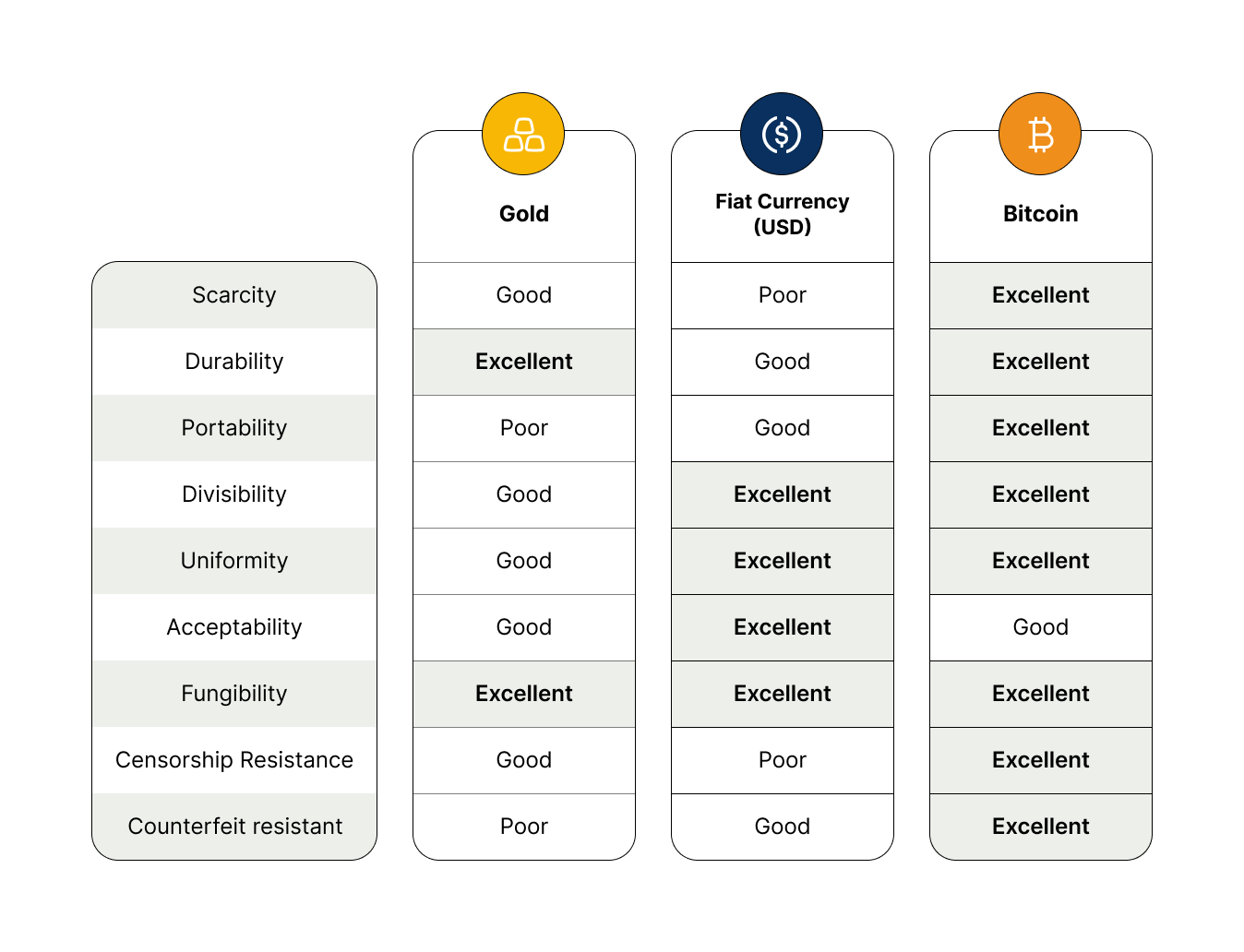 After centuries of trial and error, gold eventually emerged as the universally accepted currency. Its scarcity, durability, and divisibility made it great for storing and transferring value. But physical gold wasn’t able to satisfy all the traits of sound money — it was heavy, difficult to transport, and vulnerable to theft during long-distance trade.To address these limitations, a new solution was found — countries began issuing paper currency guaranteed by the government, backed by gold reserves.This paper currency is (more or less) the currency we know today. And for the past few hundred years, it was the currency that satisfied the most requirements for sound money.However, as we entered the digital age, the idea that a “digital currency” could be created to satisfy all sound money criteria began to gain traction.This is where Bitcoin comes in.
