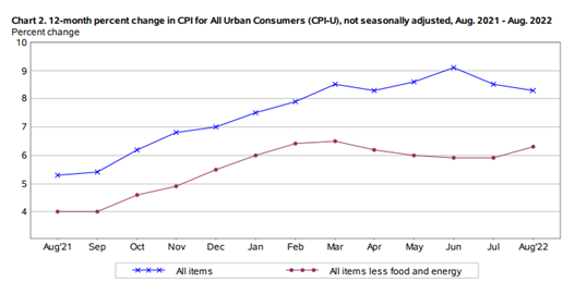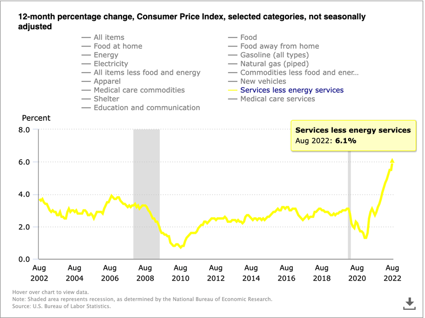 上图是从2021年8月至2022年8月间,CPI与核心CPI的走势,不难看出,从CPI在2022年6月达到最高的9.1%水平之后,出现了缓慢的下降,目前仍然在8%之上,并且从原油的价格走势来看,CPI下降的主要原因要归功于原油价格的回落。但是反观红色的这条核心CPI的曲线,很明显的,从今年6月之后,核心CPI不降反升,这就说明,在出去了食品和能源之后,通胀是在继续走高的,并没有随着原油的价格下降而降低。这是一个非常不好的信号,就说明,通胀已经渗透到了经济的其他领域,想要降低通胀,就不是打压油价这么简单了。