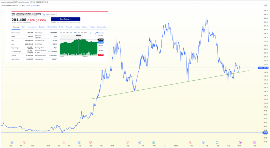 相较于传统燃油车,电动车由于新增电驱电控、OBC、DCDC 等模块,因此对于功率半导体的需求量提升;车规级半导体作为汽车电子的核心元器件也是比亚迪不断积累的优势,自2005 年搭建IGBT经过十余年的发展具备IGBT相关产品的IDM 能力。车规级半导体的技术迭代周期长,海外厂商与中国厂商技术差异有限:随着芯片国产替代化,比亚迪市场份额有望保持领先。2022 年上半年比亚迪在国内厂商中车规级功率半导体市场份额居首位占比约19.5%。当前中国厂商车载功率半导体市场份额已达到40%+,比亚迪与斯达半导、中车时代保持市场出货量领先地位。随着以上三家厂商产能爬坡提速、以及士兰微功率半导体开启大规模车规功率半导体量产,我们预计2023-2024国内出货的车规级功率半导体占全国市场份额将至50%+。3,销售渠道广泛布局截至2022/11比亚迪累计经销门店超过2,200家远高于tesla和其他新势力<450家 ,更多的实体销售场景和产品覆盖,创造了更多的客户接触机会,为销量奠定较强的渠道基础。2022年比亚迪累计出口销量是5.6万辆,与特斯拉相比有很大的进步空间,也是未来很重要的一个盈利增长点,通过海外经销布局和上市车型完善布局将驱动销售和出口提速,预计2023年比亚迪销量会达到290万辆,出口销量25万+辆。比亚迪的投资价值依托DMi及E3.0两大先进技术平台,技术驱动产品量价齐升,高端化路径清晰。同时公司垂直一体化供应链优势最大化抵御行业不可抗力影响。我们看好公司技术驱动产品力与品牌力持续向上。综合考虑公司 1)国内市占率领先;2)海外布局顺利推进;3)成熟整车平台/核心零部件技术;4)领先行业的盈利能力;以及 5)高端品牌形象树立,我们结合相对估值以及绝对估值两种方法,比亚迪股份H股目标价296.93 港币(对应26x 2023E PE),给予“买入”评级。技术分析图表: