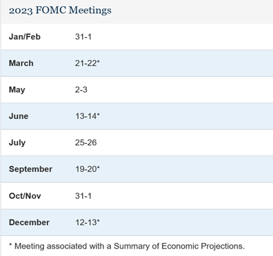 有了以上的了解,加上目前美联储官员表态后拼凑出的信息,美联储大概率会在2023年初加紧提升至利率上限,然后保持高利率等待通涨回落到目标区间。但加息上限在哪呢?目前官方数据预期在5.1%,近期又有官员说是5.25%,无论最终数值是什么,美联储下一次加息25个基点的可能性在大大增加。当前美联储给出的利率决议时间表如下: