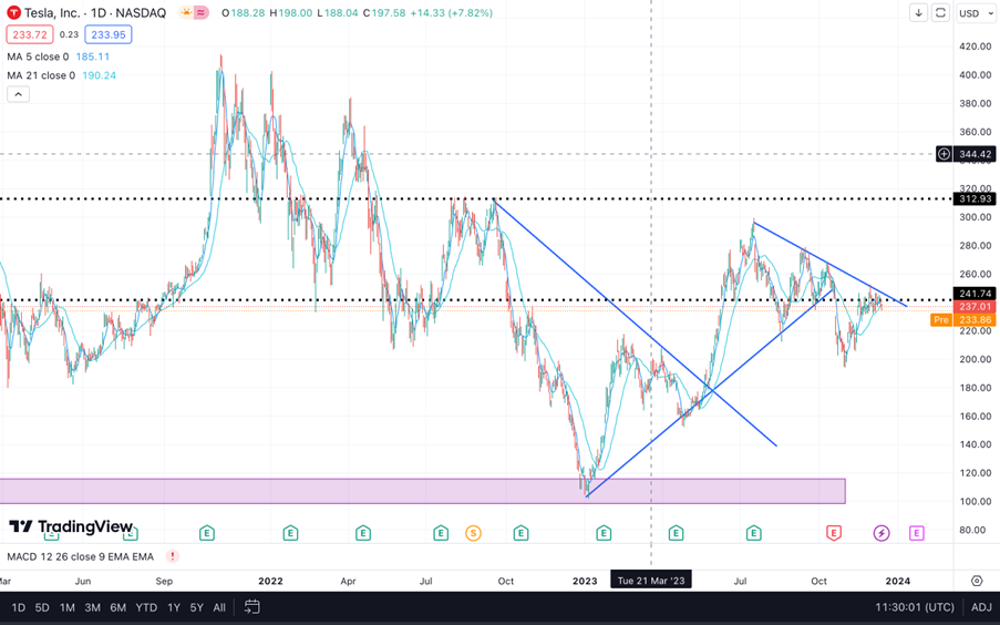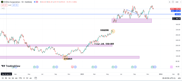 (Source:Tradingview)特斯拉VS 苹果在科技公司的比较中,苹果的产品更多是迭代而非革命性创新,而特斯拉则不断推出创新技术,包括电动汽车技术、驾驶技术和能源解决方案,以及最新的Optimus仿生机器人。特斯拉作为一家创新型公司,其前景看起来非常广阔,特别就股价而言,还有相对更大的上涨空间。而苹果则继续保持其稳健的市场表现。对于投资者来说,这些情况提供了不同的操作选择,可以根据市场动态和个人投资策略,适时进行买入或卖出,以期在波动的市场中把握利润机会。