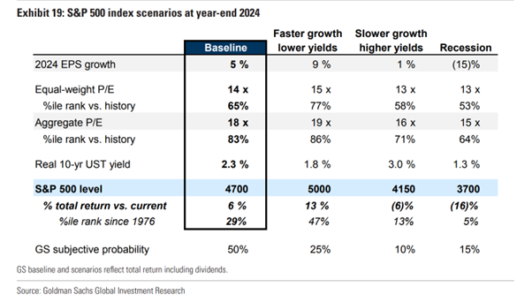 (Source:UBS)2. 澳大利亚经济:预计澳大利亚明年的通胀将降至10%以下,并在2025年回落至3%。经济增长预计将保持在稳定水平(约1.9-2.0%),显示出相对稳定的经济状态。3. 股市预测:据高盛预测,2024年美国股市(以标普500为例)可能会有5%的EPS增长。股市预计平均值为4700点,强势情况下可能达到5000点,弱势情况下则可能回落至4150点。