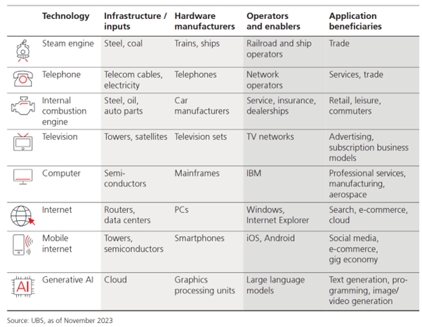 热门话题今年市场的主要话题和回顾可以集中在AI的概念上。我们见证了“生成式AI”的崛起,这超出了我们最初对AI的预期,它不仅能完成重复性劳动,还能进行创造性工作,甚至开始在某些方面取代人类。特别值得一提的是,英伟达成为AI领域首个万亿美元市值的公司,它不仅在行业中占据领先地位,还成为了全球AI技术的主要供应商。从历史角度看,近代的几项重大发明如蒸汽机、电话、内燃机、电视和电脑等,以及网络的全球化,都极大地推动了人类文明的进步。自智能手机时代以来,AI的发展速度越来越快,许多过去需要一个世纪才能实现的成就,现在可能只需几年。