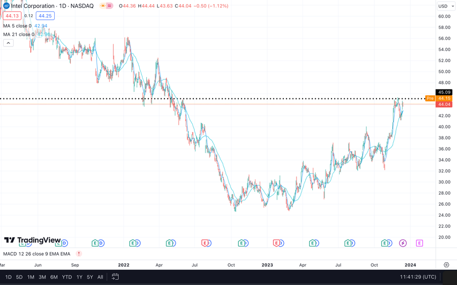 (Source:Tradingview)与此同时,英特尔的股价在今年呈现出震荡上行的趋势,其新架构的推出带来了市场对未来增长的期待,导致股价显著上升。在增长潜力方面,英特尔的表现可能超越英伟达和AMD,展示出较大的上升空间。