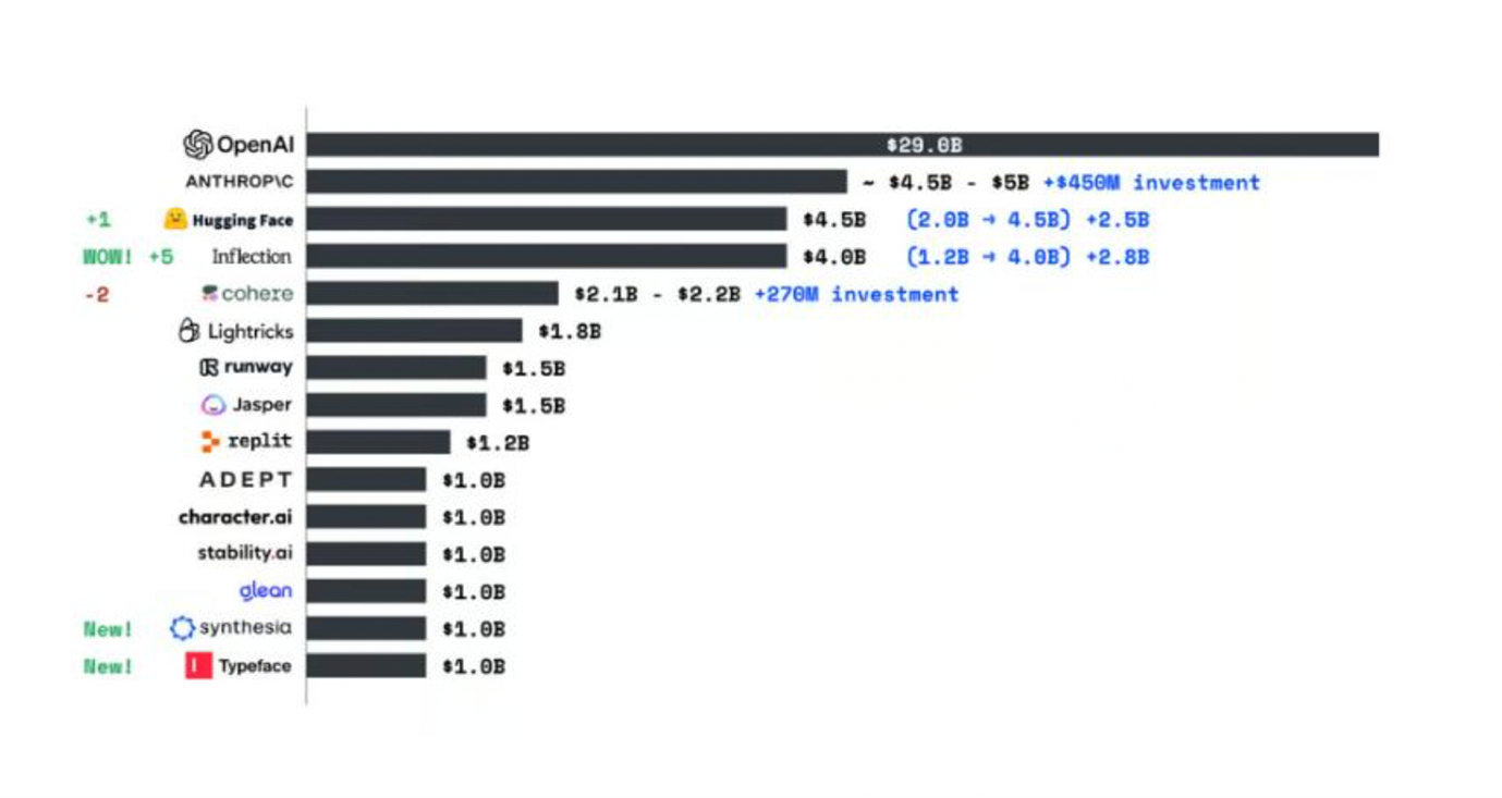 在21世纪的第三个十年,AI行业在经过了20年的技术积累之后,终于由OpenAI第一次引领潮流成功研发出了生成式人工智能,ChatGPT交互语言模型的诞生,使人类感受到了有问必答,拥有一个超强大脑是什么感觉,自己也能够变成一部百科全书的感觉有多爽。当然弊端是这也同时成了学生写作业以及考试作弊的利器。而后又随着其升级完善研发出GPT-4,能够处理更加庞大更加复杂的信息,新增了能够识别解说图像特点,按照特定条件创作文章的功能,并且优化了其逻辑推理能力。OpenAI引领了交互语言模型的潮流并使其发展逐渐迈向成熟。使基于语言的人工智能应用程序迈入了新篇章。截至2023年,生成式AI领域的大模型开发赛道已经有15家独角兽企业估值超过了10亿美元。OpenAI几乎是以超一倍的成果领先,且OpenAI也以一己之成功有效缩短了这15家公司达到独角兽估值门槛的年限,由平均7年缩短至4年。