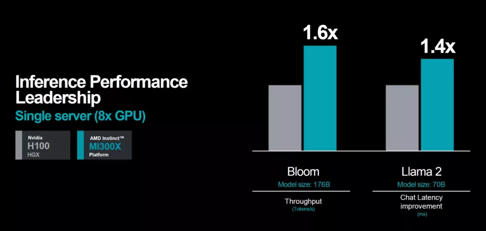 (Source:AMD)Instinct MI300是AMD推出的一款革命性设计的数据中心级APU,它集成了13个不同的芯片组,其中包括多个采用3D堆栈技术的组件。这款APU结合了24个Zen 4 CPU核心、一个基于CDNA 3架构的图形引擎,以及总共八堆的HBM3内存,创造出一个极具实力的芯片。它拥有惊人的1530亿晶体管数量,是AMD生产线上最大的芯片之一。在性能方面,AMD宣称其Instinct MI300X GPU在AI推理任务上的性能比Nvidia的H100 GPU高出1.6倍,并在训练任务上提供类似的性能。这使得Instinct MI300X成为一个高性能的替代选项,与英伟达的GPU产品竞争。更为引人注目的是,这款加速器拥有的HBM3内存容量是英伟达GPU的两倍多,达到每片192GB,使得MI300X平台可以在系统中支持的大型语言模型(LLM)数量是英伟达H100 HGX的两倍,同时运行更大的模型。