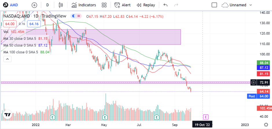(source:AMD)最后一个就是功耗,发布会上就可看到,其功耗较低了60%, 看了极客湾测评,在同频下,和上代相比,功耗的确是降了60%,性能增加,功耗降低,低碳环保,这点倒是做的很不错,电费也省了不少。总结来说呢,性能比上代提升较大,但是没有完全干掉12代酷睿,相信大家还是会有些失望。因此,在新产品发布之后,AMD的股价并没有太大的上升,因为预期给的足够高,这次新产品并没有达到甚至超过预期。技术面来看,AMD股价已经跌破了区间带70-73下方有着不少的空间。如果AMD股价要回到原来的节奏上,势必需要先突破70-73阻力带。最后,我们也展望一下AMD下一代显卡会不会给我们带来更多的惊喜。