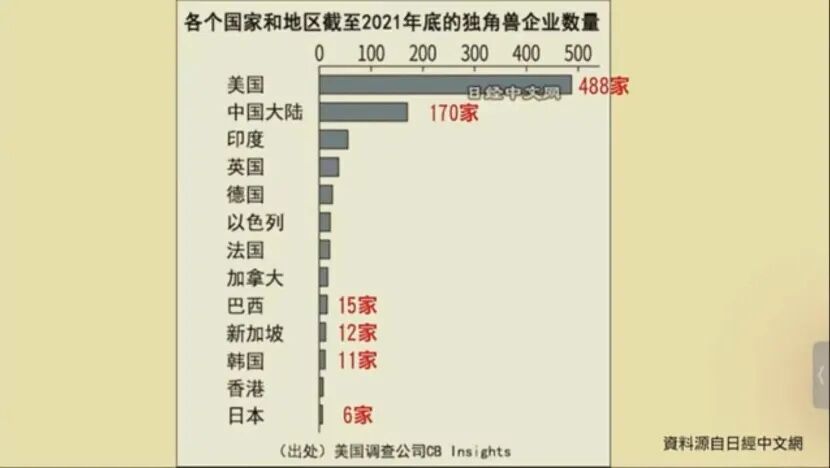 2010到2016年主要由于核能政策的调整,日本大量进口天然气石油煤炭,日本从顺差国变成了逆差国。日本曾经在2016年、2017年有出现短暂的顺差,但很快得又成为贸易逆差国,简单说日本的产业竞争力没有提升。这也能从另外一个角度得到印证。独角兽一般代表一种新兴的经济力量,独角兽的数量一般体现了一个国家的经济活力和模式革新。到去年底为止,全世界独角兽数量较按国家来分的话,第一当然是美国,488家,是独占鳌头将近一半的,中国当时有170家,日本就只有6家公司。
