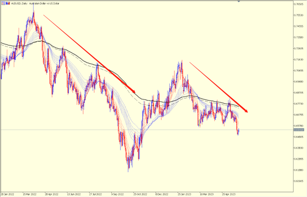 熟悉我们节目的朋友们应该知道,在很多年前,只要我给大家分析澳元走势,一定离不开三句话,也就是影响澳元走势最大的三个因素:铁矿石价格,中国经济,和美元自己的强弱表现。而今天再回到澳元上面图形里的两个大跌趋势,依然没有脱离上面说到的3个因素。如果各位还有记忆的话,2022年3月,其实就是当时上海全面爆发的时候。澳元也从那时开始下跌,一直跌到了2022年的10月。当时从中国主要城市来看,似乎已经无法做到清零了,最终2022年的11月全面放开,虽然在当时病例突然激增。但是在2023年初春节后终于渡过了第一波高峰。而澳元的反弹,也就是从全面放开,到第一波结束。但是为什么第一波都结束了,反而澳元开始下跌呢?如果用一句话来形容,就是中国经济的报复性反弹,没有市场预期来的强烈。的确是有报复性消费,报复性旅游,报复性反弹,但是都远低于了市场的预期。而不断发布的低于预期的经济数据,又间接地使得投资者对于未来所需要使用到资源的总量产生了怀疑。进而进一步拉低了铁矿石等大宗商品的价格走势。从下方过去半年国际铁矿石价格走势我们不难看出,影响澳元最大的因素:铁矿石的价格,在短短3个月时间里下跌超过了25%。从3月中高峰时期是超过900人民币一吨,下跌到不到680人民币一吨。