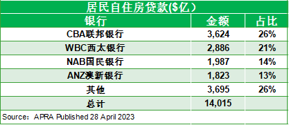 净息差已达峰值 澳联储加息尾期净息差NIM,即贷款收取的利息与为贷款支付的利息之间的差额,贷款是银行的核心业务,主要的盈利方式是通过融资与放贷之间的利息差赚取利润。在加息环境下一般认为净息差将提振银行净息差利润,然而由于澳洲房贷市场的激烈竞争,原本预期较高的息差利润效应受到侵蚀。根据澳大利亚审慎监管局4月28日发布的数据(截至3月),目前居民自住房贷款市场CBA占有最大份额,达26%,WBC西太银行21%紧随其后,NAB及ANZ各占14%及13%。