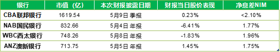 热门话题五月以来,澳大利亚四大行已经陆续披露最新业绩报告。其中,NAB国民银行于5月4日率先公布半年报,股价单日下挫超6%,拖累银行板块。ANZ澳新银行、WBC西太银行紧随其后公布半年报,而CBA联邦银行于本周5月9日发布季报。市场反应来看,银行股整体表现不佳,这主要是由于两大预期扰动:净息差增长见顶以及经济放缓。