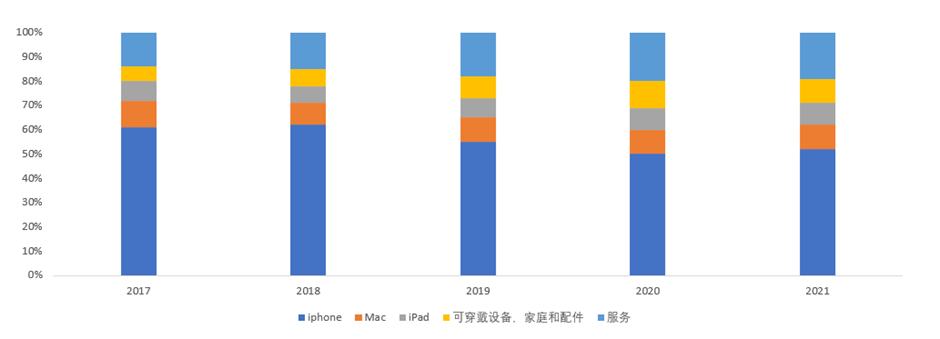产品市场空间巨大。目前,每10个美国人中就有1个患有糖尿病,全球成人糖尿病人数当前已破亿。为了监测血糖状况,糖尿病患者通常需要依靠穿刺皮肤的设备采集血液样本。然而,采血频率有限,两次测量之间的血糖可能出现漏测或高低状态。CGM(连续血糖监测)被认为是一种更好的监测方法,通过植入皮下传感器,可以24小时连续监测血糖水平,并将数据发送到电脑,用软件分析患者的血糖状态。目前,市场上主流的CGM产品是Dexcom和Abbott Laboratories等公司的血糖监测贴片,但此类贴片一般需要每两周更换一次。如果苹果公司的技术得到成功应用,将可能颠覆数十亿美元的糖尿病医疗行业。观测苹果过去的业绩,苹果公司主要营收来源仍为iPhone。FY2017-2021,iPhone营收占公司总营收的比重均超过50%。服务业务逐渐兴起,构建了更完整的业务发展模式,为公司的第二大营收,2017-2021占比从14%上升至19%。可穿戴设备、家庭和配件为第三大营收。利润方面,公司毛利率一直保持在行业较高水平, FY2014-2021,公司毛利率从39%提升至42%。主要是由于高毛利产品销售额占总销售额的比例较高,以及iPhone价格上限的持续提高。公司成本管理能力得到提升,净利润保持较高水平。公司净利率从2014财年的22%上升至2021财年的26%,主要得益于成本优化。销售费用率方面,2021财年销售费用率为5.82%,同比下降1.43个百分点,研发费用率方面,2021财年研发费用率为5.99%,同比下降0.84个百分点,两种费用率2022年均有小幅回升。图表:Apple营收格局2017-2021FY
