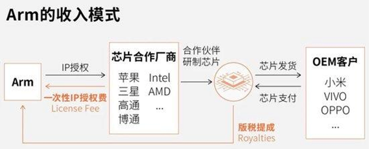 热门话题软银旗下的英国芯片公司Arm在8月正式提交了IPO申请,几年前私有化的芯片设计巨头为何突然又要上市了?今天我们就来了解下Arm以及它上市所面临的挑战。毕竟这笔上市有望成为今年美股最大规模的IPO,也是继阿里巴巴和Facebook之后的美股历史第三大IPO,这也将对本就需要更多流动性的美国高科技板块造成明显抽血效果。据Arm自己所说,几乎所有全球智能手机都离不开Arm的技术,Arm的高效能CPU已经被全球99%以上的智能手机采用,全球大约有70%的人口使用了基于Arm架构的产品。Arm是一家独特的芯片公司,不生产芯片,而是通过出售芯片架构授权来盈利。具体来说,Arm的收入主要来自两个方面,第一是将芯片设计方案即知识产权(IP)授权给苹果、三星、高通等芯片公司,并收取一次性费用;第二方面是芯片公司使用Arm IP进行芯片生产并销售给手机品牌后,按照每块芯片售价的比例向Arm支付版税。