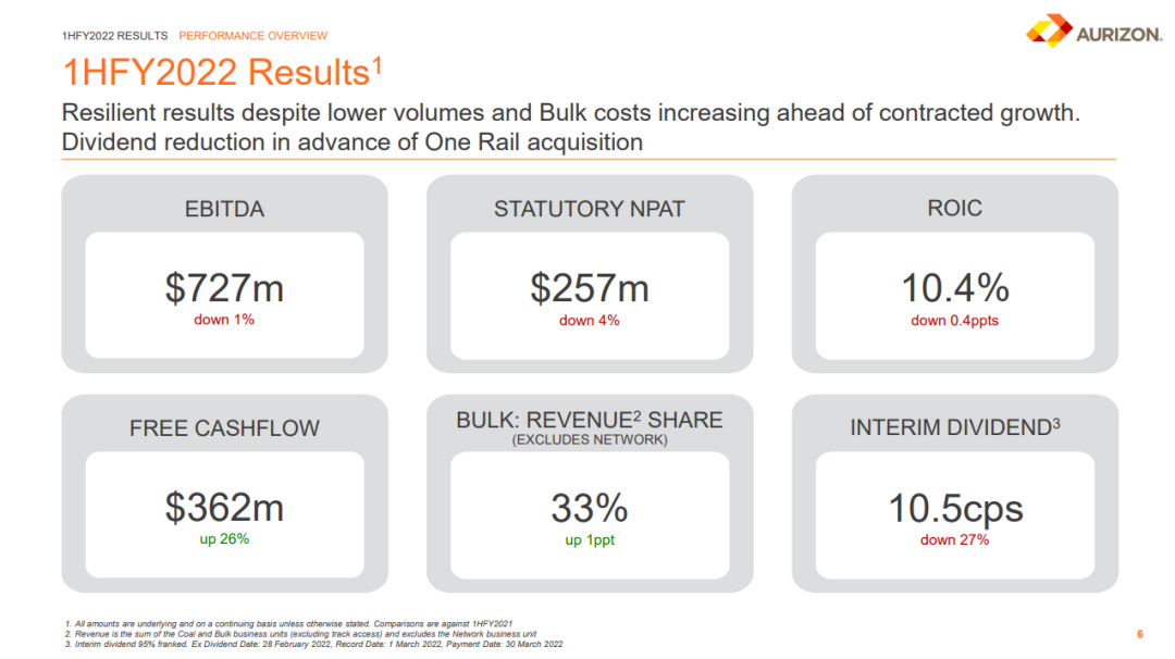 上半年 EBITDA 下降 1% 至 7.27 亿澳元,NPAT 下降 4% 至 2.57 亿澳元,但去年同期受益于一次性网络收入 4,900 万澳元。不计一次性收入,EBITDA 将增长 5%,可观。正如预期的那样,在将派息率从基础 NPAT 的 100% 降至 75% 后,股息下降 27%至每股 10.5 澳分,因为该公司保留收益以帮助为 23.5 亿澳元的 One Rail 收购提供资金。煤炭部门 EBITDA 增长 4% 至 2.86 亿澳元。煤炭运输量没有像预期的那样恢复——它们比去年同期下降了 3%——现在的指导是全年运输量与 2021 财年持平。但这并没有显着影响收益,因为有利的客户组合转变、与 CPI 挂钩的关税增加和成本节约力度更大。