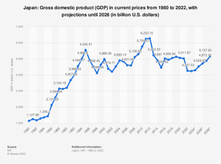 (来源:国际货币基金组织数据统计2023年)日本的美元计价GDP可以从2012年的6万2千亿美元,下跌到2016年的4万4千亿美元,如果不告诉你,你肯定以为日本经济在短短4年时间里下跌了接近30%。但是真实情况并非如此。如果我们输入日本经济GDP日元单位走势图后,就可以看到下面这个图: