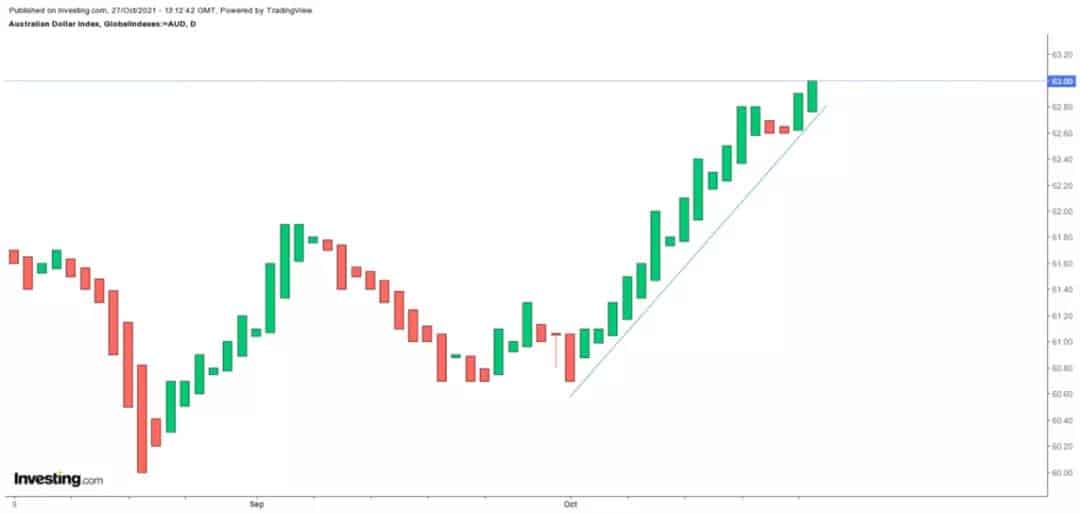 还有另一个角度就是一个估值模型的问题。其实很多企业他们的股价,或者说他们的估值,是会将国债收益率考虑进去的。在投资里面,把钱借给“稳定”的国家就属于一种风险最小的投资方式,因为这些国家崩盘的可能性比较小嘛,所以这些国家借贷而产生的利息,一般就会被认为是一种无风险的投资收益。那当我们把钱投到波动更高的股市里面,肯定是想要获得超过这些无风险收益的回报的。所以,当无风险收益提高以后,在我们总的预期收益不变的情况下,我们会选择风险相对较小的,收益更为稳定的板块进行投资。所以这也是为什么当国债收益率上升的时候,受冲击最大的,通常是科技股这类风险比较高的资产标的。如何应对通胀以及国债收益率的上涨?通货膨胀是系统性的事情,是我们没有办法避免的,因此我们应该积极的寻找方法去去应对它。因为如果什么也不做,我们手里的现金确实是会越来越没有价值的。但是对于已经开始了投资的朋友,实际上也是有规避的方法的。比如,我们刚刚说到的,那既然受到国债收益率上涨冲击最大的通常是风险较高的科技股,那已经重仓了科技股的投资人,就可以考虑调整自己的仓位,适当增加防御板块的股票权重,以此来提高自己投资组合应对风险的能力。图三:澳币指数十月以来都呈现上升趋势