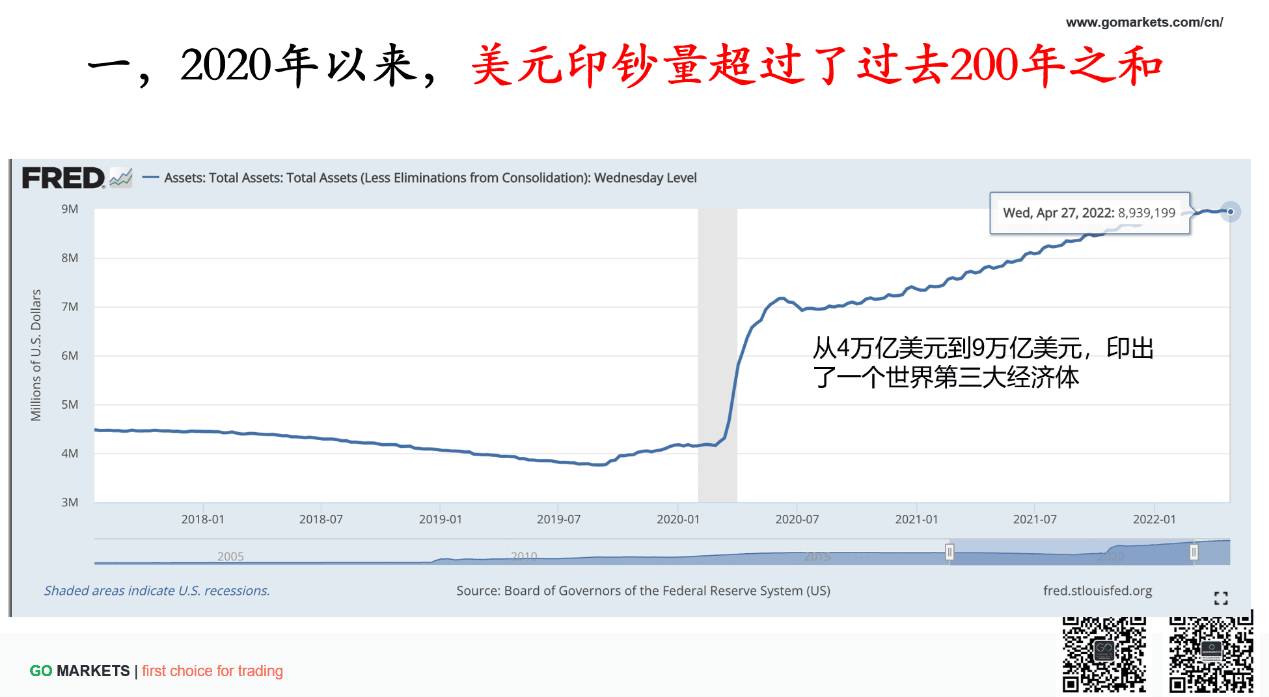 时间来到2022年,年初到现在比特币已经跌去了一半市值,而黄金在一季度冲击前高2070后,仅回落了10%,黄金和比特币的表现不大相同了,为什么同样在面对通胀,市场却给出了两种不同的结果呢?2020年美国开动印钞机疯狂释放流动性的情况下,比特币走强的逻辑就是弱势美元和通胀预期,基于对政府无底线印钞的不信任,整个金融市场都狂热的追捧逐险(risk-on)资产,数字货币都在讲一个故事,“去中心化”和“隐私保护”。大家相信各国政府天然具有滥发钞票的冲动和掠夺人民财富的本能,过去2年美国天量印钞相当于过去两百年印钞之和,更能给这个故事做一个完美的注脚。比特币在那一轮牛市中充当了交易通胀和弱势美元的核心产品,并且这个故事在互联网时代,更容易得到网络的传播和年轻人的理解。