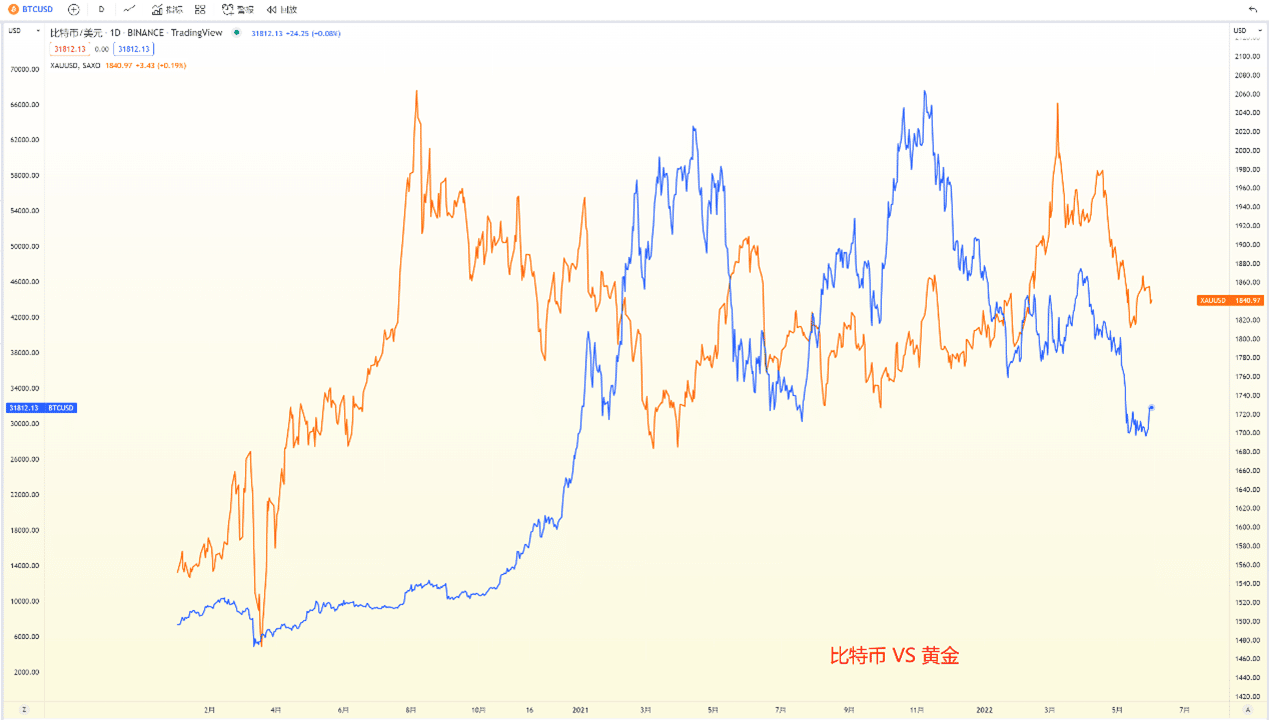 你知道吗?甚至一度市场认为未来抵御通胀的最好武器就是数字货币。人无千日好,花无百日红。今年的市场就让数字货币信徒和投机者们翻了车。黄金和比特币的纠缠突然被打破,在今年一月份比特币就开始跌跌不休,瞬间损失了25%的市值;而黄金却在一季度再次攀登历史高点2070,在如今各国通胀纷纷爆表的背景下,比特币跌去了约50%的市值到3万美元以下,而黄金到目前只回落了10%左右。在今年同样交易通胀的背景下,这两者走出反转的结果是今年的通胀背景下的变化。美联储现在要加息、缩表、抗通胀,这些挤泡沫的动作,让金融市场风声鹤唳,甚至担忧经济出现危机,再加上地缘战争冲突,黄金这种避险”(risk off)资产再获青睐,这也显示出黄金是一种用避险来对冲通胀的工具。同样是对抗通胀,比特币是一种‘逐险’(risk-on)资产,在市场情绪高涨的时候会获得更好的表现,在市场风险偏好较高时期,数字货币高波动性的特征,让投机者很容易捞它一笔。但黄金作为防御性资产,带来的是保护效应,如果将数字币视为黄金的取代性资产,会造成资源错配,从而理解不了现在的走势差异。那目前来说黄金的价格或比特币的价格是在其具有投资价值的区间内吗?