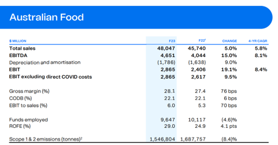 食品业务增长强劲 平均价格仍居高不下集团销售额的主要正向贡献来自于其澳洲食品业务,食品业务23财年销售上升5%达480亿,同店销售上升4.2%。食品业务息税前利润增长19.1%,达到 28.65亿澳元。食品业务利润率大幅增长 76 个基点,达到 28.1%。该增长同时反映了杂货价格的上涨,对比澳洲通胀情况也不难发现,食品依然是通胀主要推手。