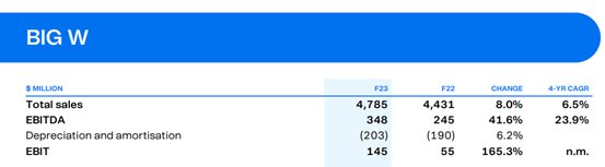 可支配收入疲软 BIG W业绩不及预期折扣连锁店BIG W 的销售额增长了6.5%,达到47.58 亿美元。这低于预计的 48.67 亿美元销售额。息税前利润增长一倍多,达到 1.45 亿美元。2023财年上半年,受到门店临时关闭后“报复性”消费影响,BIG W 上半年销售额强劲增长 15.3%,但下半年销售额较上年同期下降 0.3%,其中 6 月份季度销售额大幅下降 5.7%,原因是可自由支配支出显着疲软,契合目前澳洲家庭面临的消费支配挑战。
