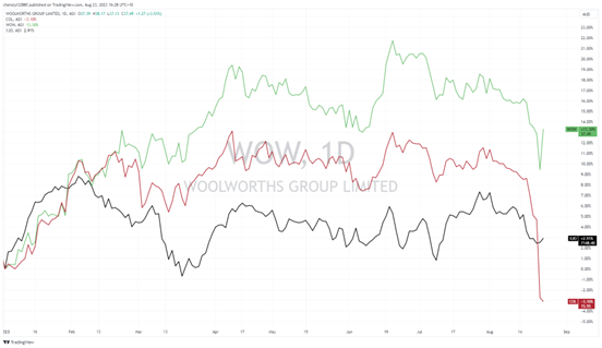 而形成鲜明对比的是,竞争对手Coles (ASX代码:COL)在前一日(本周二)财报公布当日因不及预期,股价下跌超7%。尽管Coles持续经营业务的销售额在截至6月份的一年中飙升了5.9%,但租赁续约成本激增9.4%,加上库存损失猛增五分之一(店铺偷盗情况严重)拖累了同店净值利润下降0.3%。