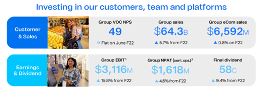 热门话题2023年8月23日,Woolworths集团(ASX代码:WOW)公布了其2023财年财报,整体业绩超市场预期,提振股价。财报显示,集团销售额在过去的12个月内上升5.7%至643亿元。集团息税前利润增长 15.8%,达到31.16 亿澳元。集团宣布本次将于9月27日派发每股58澳分的末期股息,较2022财年高出9.4%。