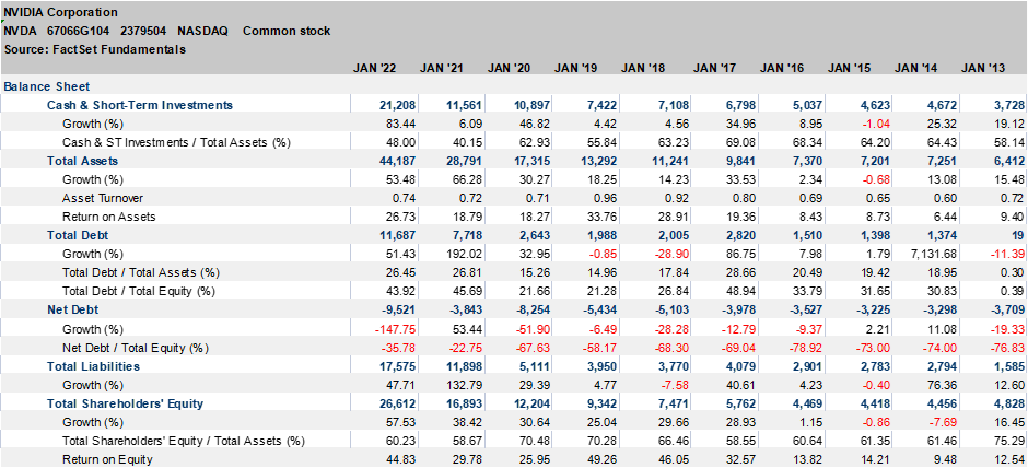 (Source: FactSet)从财报中也可以看出英伟达产品的发展历史。首先是16-19年的高速发展,10系列和20系列的显卡吸引了众多消费者。超高的性价比,独具一格的光线追踪技术,每一项都是创新与突破。于是在这几年净利润快速上涨,在16-17年更是上涨了171.34%,直接从614 million上涨到了1666million,更是在2019年到达了4141million。到了2022年财年,更是达到了9752million的净利润,增长率达到了125.12%。然后在2022年的增长是难以复制的,因为主要是虚拟货币的挖矿需求,导致30系列显卡的溢价,超额销售,因此,新的一年净利润可能不会很好看。-资产负债表: