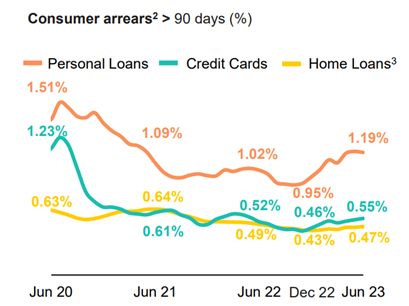 此外,越来越多的储户开始使用定期存款——1020亿澳元的定期存款比过去一年增加了24%,给CBA带来了更多成本。高利息环境下的下行风险对于后市,CBA也表示目前高利率的环境下将对贷款业务形成下行压力,叠加经济放慢增长,消费者需求下降等不利因素,均将对CBA中小型企业客户造成影响。本财年,为了应对利率上升造成的个人及企业成本压力,CBA的贷款减值拨备从53.47亿美元增加至59.5亿美元。在加息的影响下,受益于就业率高,劳动市场紧俏以及客户存款仍有余量支撑还款。尽管欠款客户数量在近几个月有所上升,但目前仍在历史低位。但是CBA同时提示风险,市场加息具备延后效应,未来延期还款客户数量可能将进一步上升。建筑业,特别是住房建设面临很大压力,导致CBA问题资产和受损资产有所增加,自22财年的64亿上升至71亿。但是这一情况已经自四季度有所改善,三季度可能是建筑领域承压最为严重的时段,未来低评级的商业地产估值将面临较大压力。