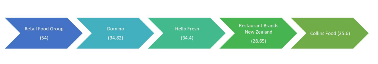 Collins 的流动性可以通过其流动比率和现金流情况来体现。首先,公司的流动比率为 0.76,较前期 0.77,有所恶化。其净现金流在此半年度也为净流出。这主要是由于投资型净现金流出的大幅增加,其中资本性现金流的支出达到了 35.9M,以及收购产生的现金流出达到了 13.1M,这部分的资金主要用于开设新的店,与 Collins 的扩张计划一致。虽然如此,但公司的现金还是有 90M,资金还是相对充足的。对于公司的运营效率,由于公司的经营性质,并不会产生太多的应收应付和库存。因此,我们在此就选用资产周转率来衡量公司的运营效率。其资产周转率约为 0.44,较前值的 0.42 有所改善,得益于销售收入增加了 8.5%,但依然较低。这主要是因为 Collins 拥有大量固定资产,包括土地,翻修和设备等。同时 Collins 也拥有大量的无形资产,特别包括因收购产生的高达 438M 的外购商誉。因此,整个的资产周转率较低。随着 Collins 的扩张,可以预见未来的资产会不断增加,如何更有效地利用资产产生与之相匹配的收入,是 Collins 需要关注的问题。Collins 的盈利能力通过其营业利润率,资产报酬率和净资产收益率来分析。其营业利润率为9.7%,较 Domino 的营业利润率约为 11.7%,但略高于 Restaurant Brands New Zealand Limited 的9.6%。而其资产报酬率为 6%,低于 Domino 的 7.7%,以及其净资产收益率为 11.5%远低于 Domino 的 45.5%,而且都略低于行业平均值。考虑到快餐行业的盈利能力整体不高,同时在扩张中的 Collins,产生了大量的资产支出,因而盈利能力进一步下降。总体来说,虽然公司的负债增加,现金流减少,但是其资产负债表依然强劲,但是公司主要需要解决的是如何提高其资产的利用率和盈利能力。估值:我们通过对比估值法来确定一下 Collins 的现股价的情况。现在Collins 的股价为 9.48,每股收益为 0.37,所以其市盈率大概为 25.6 。我们将 Collins 与其相似的竞品公司比较,在此选择Domino’s pizza Enterprises Limited (DMP.AX), Hello Fresh SE (HFG.DE), Retail Food Group Limited (RFG.AX), Restaurant Brands New Zealand Limited (RBD.NZ), 并将这些公司的市盈率与 Collins 比较。如下图所示,我们可以看到 Collins Food 的市盈率与行业其他公司比较偏低,表示其股价可能被低估。