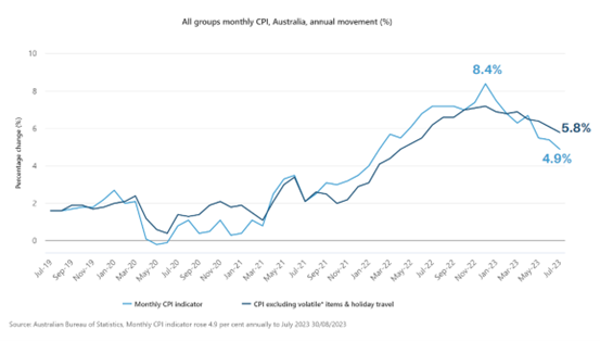 热门话题昨日(周三)澳大利亚东部时间上午11:30,根据澳大利亚统计局(ABS)的最新数据,截至 2023 年 7 月的 12 个月中,月度消费者价格指数(CPI)指标上涨了 4.9%。本次4.9%的年增长率低于6月份的5.4%,超市场预期(5.2%)放缓。通胀意外急剧下降增强了人们对储备银行不会再次加息的预期,也就是说下周二即将离任的行长 Philip Lowe 的最后一次会议上大概率将现金利率维持在 4.1% 不变。数据公布后,交易员削减了进一步加息的押注。市场定价意味着今年剩余时间现金利率维持在 4.1% 的可能性为 62%,高于周二的 52%。