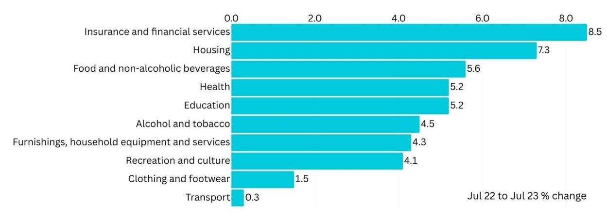 对 7 月份CPI年度增长贡献最大的是住房(+7.3%)以及食品和非酒精饮料(+5.6%)。汽车燃料(-7.6%)和水果和蔬菜(-5.4%)的价格下跌减少了7月份的涨幅。