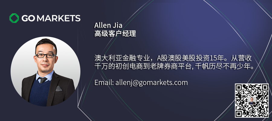 今天与大家分享的仍然是A50指数:自A50一路上涨至20600之后,近两周时间A50指数出现较大幅度波动,但A50仍然身处自去年1月开始的上涨通道当中,对于A50而言上方的18500与下方的17500分别会是阻力与支撑。截至目前A股上涨趋势并未发生变化。免责声明:GO Markets分析师或外部发言人提供的信息基于其独立分析或个人经验。所表达的观点或交易风格仅代表其个人;并不代表GO Markets的观点或立场。