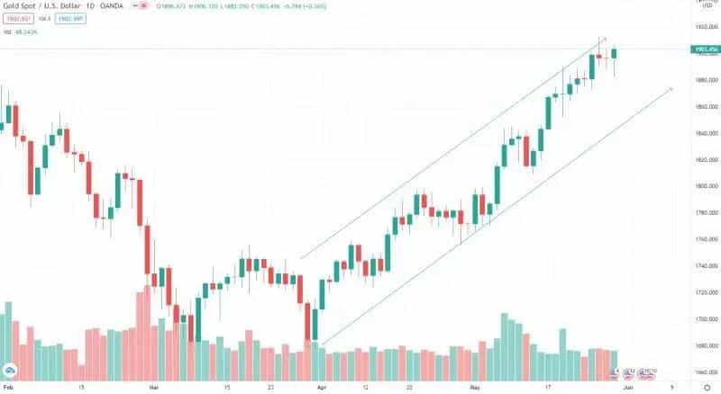 XAUUSD黄金:黄金价格依旧在强势上涨通道内。日线级别没有出现明显回调。多头依旧强于空头。上方还有上涨空间,下方支撑价格为1880美金。近期较为合理的交易策略是等待黄金价格回调至关键支撑价格1900下方适当买入,止损设置在1880下方。若黄金持续上涨,则继续持有多单,直至出现明确回调下跌信号。免责声明:GO Markets分析师或外部发言人提供的信息基于其独立分析或个人经验。所表达的观点或交易风格仅代表其个人;并不代表GO Markets的观点或立场。联系方式:墨尔本 03 8658 0603悉尼 02 9188 0418