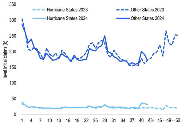 当前市场对于“特朗普交易”的定价,一方面是政治选择性的,偏向定价正面影响,包括进口关税增加、国内税收下降以及赤字扩大影响下的美元美股强劲;另一方面,尽管特朗普支持率上升,他的领先幅度并不确保胜利,仍然存在特朗普+分裂国会的可能性。上周我在文章里说过了,只有在共和党控制国会和特朗普当选同时发生的前提下,特朗普的政策才有望得到最大程度实施。在此背景下,市场波动将加剧。非农就业数据上看,超预期和不及预期可能获得市场一致解读从而助推美元。8月初和9月初的数据不及预期,导致美股和日本股市大幅回调。而本周五即将公布的非农就业数据很可能显著低于9月的254,000,市场预期的新增就业数据为115,000,失业率将维持在4.1%。市场普遍认为,飓风对就业将带来显著影响,彭博部分经济学家更是预测非农数据可能首次转负。然而,即便就业人数下降至115,000,因市场预期已经调低,所以市场仍可能解读经济韧性仍较强,甚至推动利率继续上升,从而利好美元。如果本次非农数据极为疲软,加上美股等风险资产已经累积相当涨幅,叠加大选情绪渲染,可能引发市场避险上升,日元和黄金都是常见的避险品类。另一种可能性是,市场冷静后或将此次较差的就业数据视为暂时性问题,类似于8月数据差只是因天气差造成的偶然情况,这样的解读可能会导致美元短期下跌调整后出现反弹。而且,数据也显示,本次只有飓风州的失业申领上升,其他州是下降的,这代表本次数据可能只是一次由天气因素主导的偶然事件,就业市场并没有显著恶化。