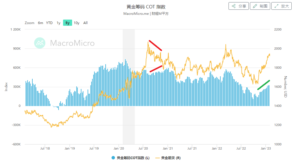 体量上看,截至昨日净投机头寸为33.82万合约(1合约等于100盎司),远低于2022年度峰值的58万、2019年9月的65.7万和2020年历史峰值的73.9万。所以结论也是目前价格上涨,但是市场上黄金的净投机头寸没有大幅增加,和持仓量指标指向的结果一致,后市应该金价还会伴随头寸的上升而上涨。可以看出,当前头寸呈持续上升,并未出现拐头,因此大众不宜过度和过早看空。需要注意的,市场是多空博弈结果,坚持多空观点同时价格出现阶段性调整都是正常的。如果黄金处于新的牛市,调整会将是温和的。看了上述两个指标,没有必要担心黄金过于超买或黄金多头过于旺盛。如果金价的调整幅度超过预期,或者调整时间过长,那只有是基本面发生了负面变化,比如2023全球经济确认避免了衰退。免责声明:GO Markets分析师或外部发言人提供的信息基于其独立分析或个人经验。所表达的观点或交易风格仅代表其个人;并不代表GO Markets的观点或立场。联系方式:墨尔本 03 8658 0603悉尼 02 9188 0418中国地区(中文) 400 120 8537中国地区(英文) +248 4 671 903作者:Jack Lin | GO Markets 新锐分析师