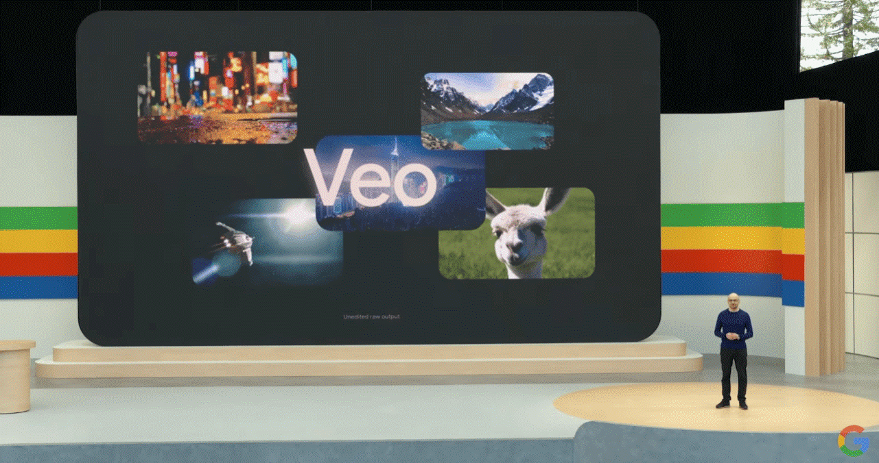 同时得益于Gemini的多模态功能,谷歌搜索可以通过拖片搜索产品的相关信息,还能够直接圈出图片的一部分进行搜索。还另有ask photo功能可以直接在图库中定位想要找到的照片视频。3. 推出视频处理器Veo对标Sora谷歌表示Veo是目前他们所研发出来的最为强大的视频生成模型。首先他可以生成具备各种电影和视觉风格的1080p的高分辨率视频,能够理解“延时拍摄”和“风景空中拍摄”等电影术语和拍摄概念,并且Veo可以制作时长超过一分钟的视频。