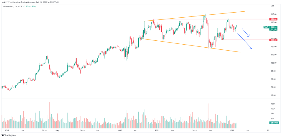 不确定性促使沃尔玛在观察美联储加息的影响时,对2024财年发表了谨慎的展望。公司CEO McMillon在电话财报会议上表示,不确定性很多。“美国可能会陷入衰退,不知道消费者支出、裁员和家庭收入会发生什么变化。因此,考虑到现在还有很多未知因素,我们采取谨慎的展望。”公司首席财务官John Rainey也表示,目前利率上升、储蓄率下降,购物者仍在减少购买可选消费类目,不确定的经济环境下,下半年销售将放缓。技术分析:周线级别看,公司股价曾在2022年4月18日达到高点160美元,结合交易量和技术形态分析,属于主力拉高出货,随后价格快速跌至118美元左右。公司股价近一年没有再创新高,仍处于自2020年8月至今的三角扩张整理走势,目前价位在144美元。笔者的偏见是,技术上看后市不容乐观,有较大可能形成头部反转下跌。近期上方阻力参考154和160,下方支撑参考128和118,看空策略盈亏比较大。沃尔玛属于道琼斯指数成分股之一,道指当前下行破位,已经录得两日连跌。昨日沃尔玛下行2.1%领跌道指,再结合公司悲观前景,个人观点,逢高做空策略胜率也会较大。