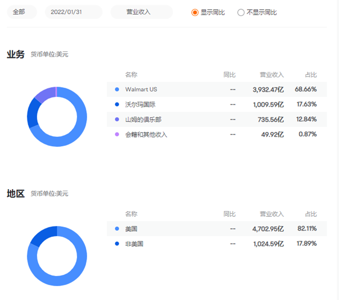 沃尔玛创立于1962年,是世界上最大的消费品零售商,2014年起被美国《财富》杂志连续8年评选为世界500强排行榜榜首。创始人沃尔顿控股48%的股权,妥妥的家族企业,公司有8500家门店,遍布全球15个国家。目前提供约1100万种产品,涉及食品、服装、杂货、电子产品、家居用品等。根据2022财年的报告显示,其中美国市场营业收入占比82.11%,达到4702.95亿美元。请注意,沃尔玛公司将2月1日至次年1月31日设为一个会计年度。