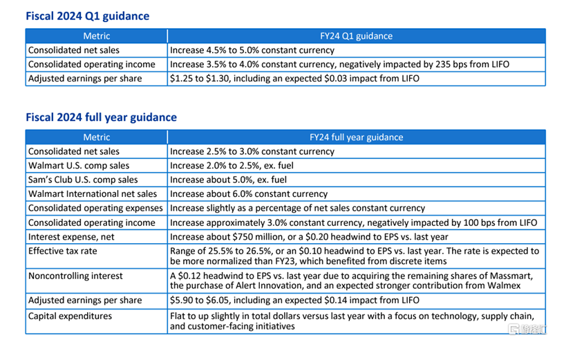 具体来看,在美国地区沃尔玛的销售额同比增长8.0%,为1137亿美元,公司在美国零售市场的份额持续增长;该公司的国际收入增长2.1%,至276亿美元,其中墨西哥、中国和加拿大的收入增长最多;子品牌山姆会员店的销售额增长12.2%,为214亿美元。分析指出,沃尔玛亮眼的业绩得益于消费者在高通胀环境下寻求低价。沃尔玛首席执行官Doug McMillon表示,沃尔玛的市场份额正在增加,包括高收入人群,这占到了在美国市场的收益近一半。然而,2023财年调整后的每股净利润为6.29美元,是近六年里利润首度出现同比下降。不仅如此,悲观的业绩指引预测,公司到2024全年调整后每股收益还会降低,仅在5.90美元至6.05美元之间,低于前值6.29美元,也低于预期6.5美元,意味着零售巨头将面临连续两年利润下滑。当天改消息引发沃尔玛股价在盘前大幅下跌,但是随后收获小幅上涨。