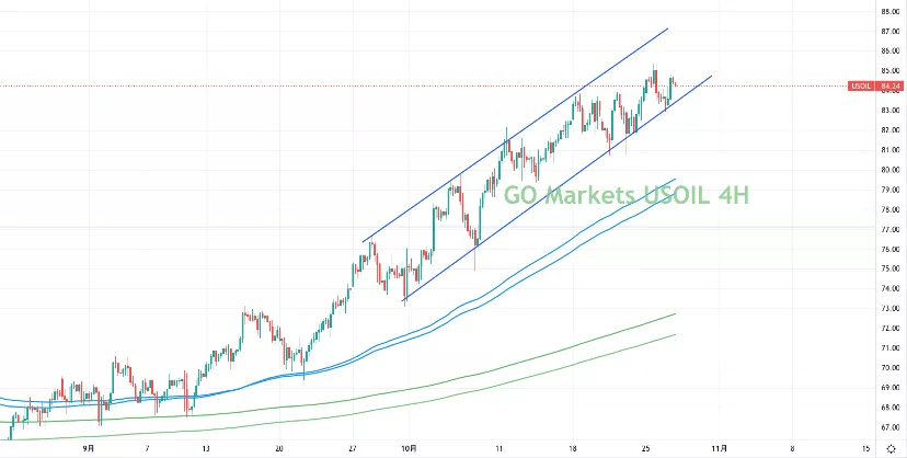 需求方面,国际能源署和OPEC近期也是上调了2021年全球原油的需求,近期全球能源形势紧张,包括天然气、煤炭价格均出现暴涨创新高,极大提振石油替代需求预期,另外北半球的冬季即将来临,对于取暖用柴油以及天然气的需求只增不减。如供需紧张局面无法得到有效改善,油价大概率仍将强势上行。2022年以后,油价可能会保持结构性高位,因为石油需求将继续上升,而新供应的增加将滞后于消费的增长,这主要是由于疫情期间油价低迷导致的投资不足,以及石油巨头削减排放和投资新供应的压力。美原油周一突破85大关,为2014年10月以来首次,这是不是意味着低油价的时代即将终结呢?考虑到现在居高不下的通胀数据,并且多家投行也看好原油前景,所以这种担忧也是有可能的。从技术面上分析,目前来看,原油还是处于上行通道当中,所以方向呢我们还是比较明确的,对于原油来说整体考虑逢低做多的思路,并且可以配合梯度建仓的策略。美国原油4小时图