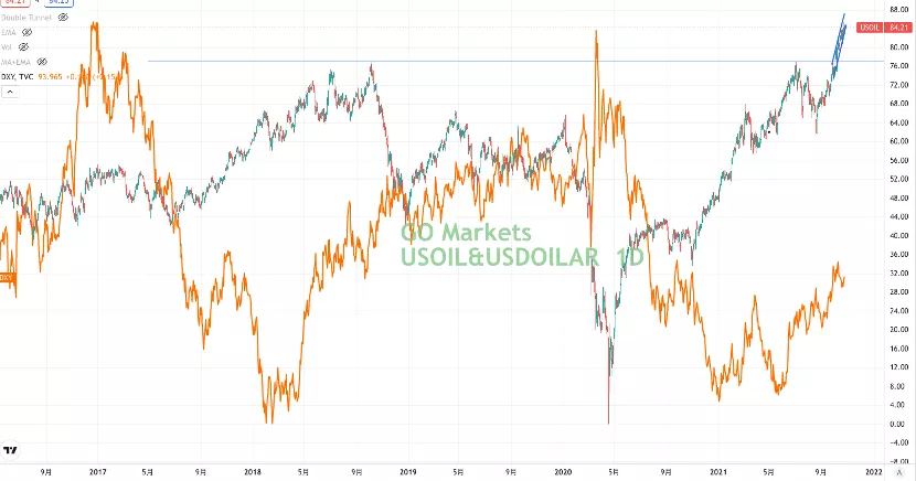 另一个是美元指数,原油与美元指数呈现较高的负相关性。从宏观来看随着后期美国流动性收紧,逐步缩减购债,美元仍有望延续上涨的趋势,从而对原油上涨产生压力。美国原油与美元指数 1D