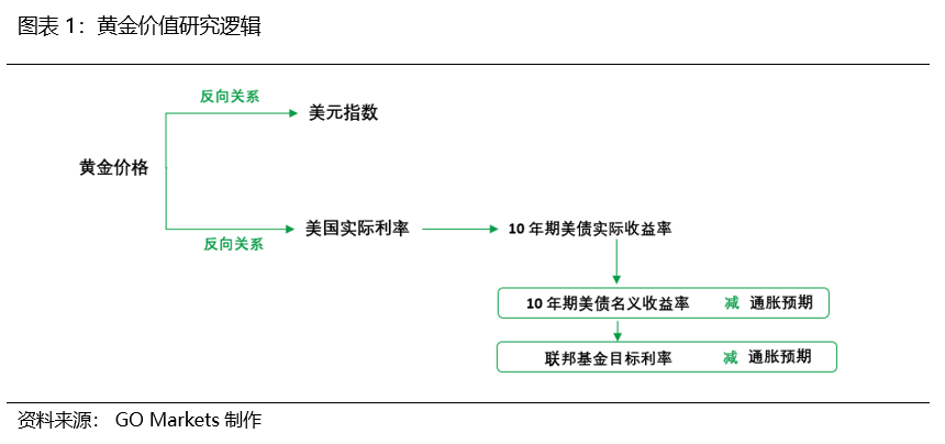 黄金价格与十年期美债实际收益率以及美元指数呈现反向关系。从图表2中我们可以看到从2003年至今,大多数情况下黄金价格走势都与美国十年期国债实际收益率呈现反向走势,可谓此消彼长。因此,预测十年期美债实际收益率也就可以进一步预测黄金走势。那如何预测十年期美债实际收益率呢?它等于十年期美债名义收益率减去通胀预期。而十年期美债名义收益率主要由美联储调节的联邦基金目标利率水平来决定。因此,我们需要跟踪观察的是美联储的利率政策和通胀预期,这也是为什么当前市场上对此两个指标的关注度非常高的原因。