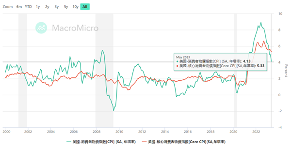 热门话题6月13日周二,美国劳工统计局的数据显示,美国5月CPI同比上升4%,连续第11次下降,为2021年3月以来最小涨幅,预期值4.1%,前值4月CPI为4.9%。剔除波动较大的食品和能源的核心CPI同比涨幅也有所放缓,同比上升5.3%,低于前值5.5%,并创2021年11月以来最低,但略高于预期5.2%。