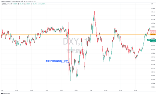 经济学家普遍认为,美国通胀状况显著改善,美联储周三将维持利率不变。但是也有不同的声音,尽管5月份的通胀率已降至去年峰值的近一半,但仍远高于美联储目标水平2%。美联储仍可能随时回归到加息之路,年内降息可能道阻且长。美元指数美联储加息预期最为直接影响的投资品种就是美元指数, CPI最初令美元承压,原因是交易员完全认为本周联准会(FED)将“暂停”加息。美元指数一分钟内下探103.132,一分钟内跌幅达0.15%。不过,随着美联储可能在7月可能加息,且利率将大概率维持在较高水平,美元指数随后收复部分跌幅。最终消息当日美元指数DXY跌幅0.31%,收于103.306。