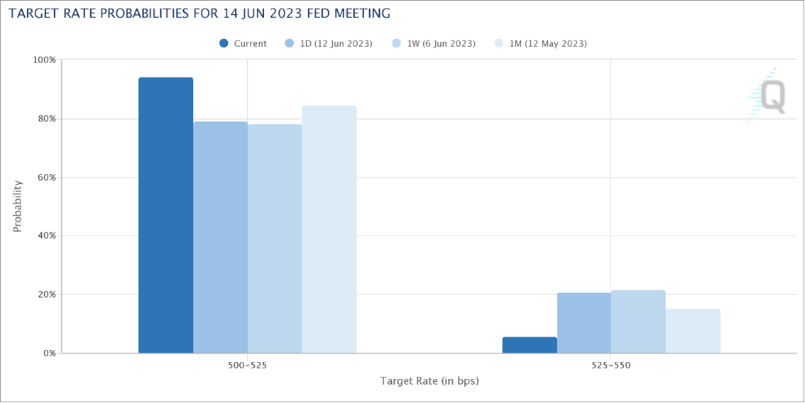 CPI数据放缓后,市场对美联储利率决议不加息的预期显著上升,根据芝商所美联储利率观察工具,目前预期美联储6月不加息概率高达94.23%,而前一日CPI未公布时仅为79.14%。